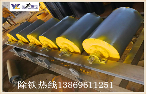 相当于把干式弱磁滚筒装在皮带运输机上代替头轮,或者说在皮带机头轮内装上磁系。磁系包角为360度。主要由:磁系、滚筒、磁轭、铝环、皮带组成。